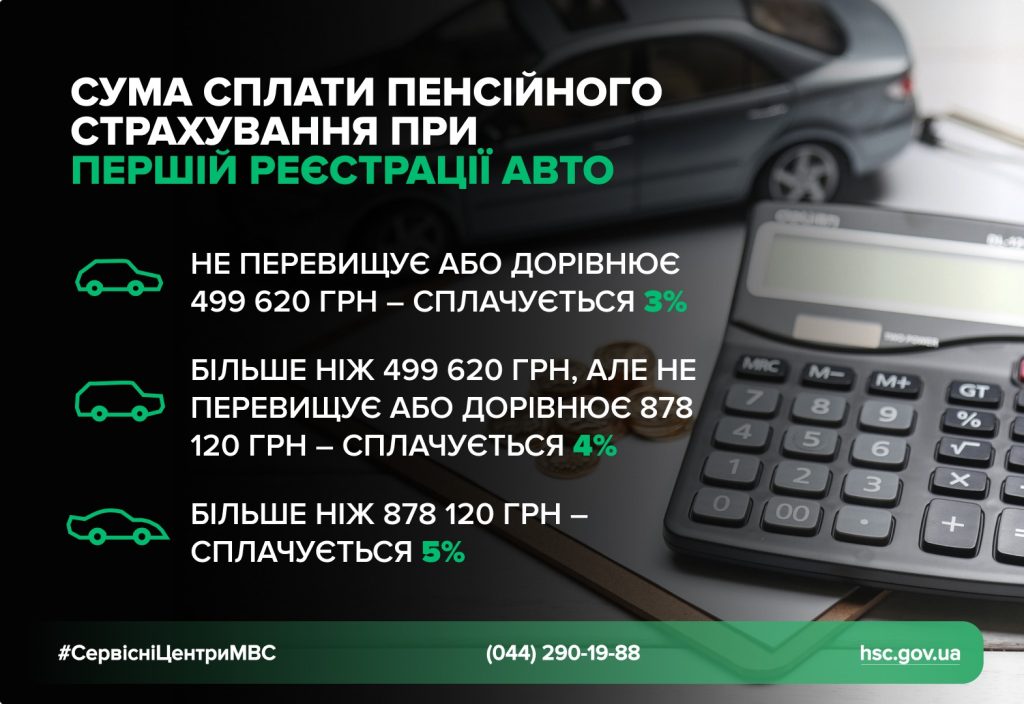 При першій державній реєстрації легкового автомобіля в Україні власник сплачує збір на державне пенсійне страхування. Цей платіж є одноразовим та обов’язковим як для нових транспортних засобів з автосалону, так і вживаних, що були ввезені з-за кордону, нагадали у МВС.