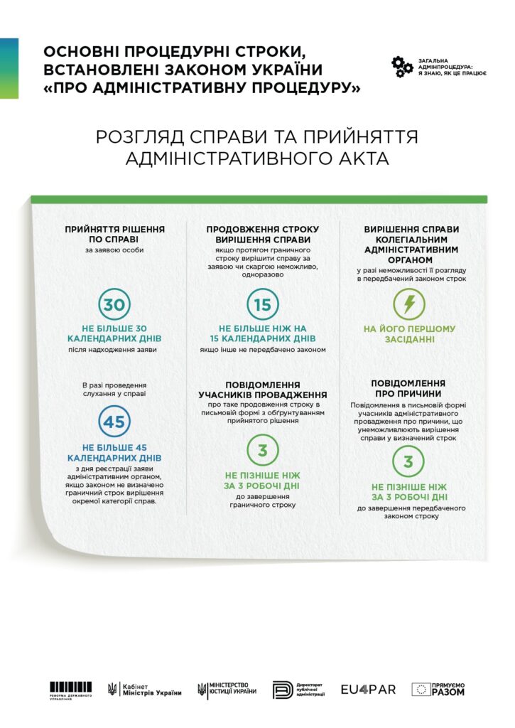 Згідно з цим Законом, адміністративний орган повинен буде розглянути та вирішити справу (прийняти адміністративний акт) у розумний строк.