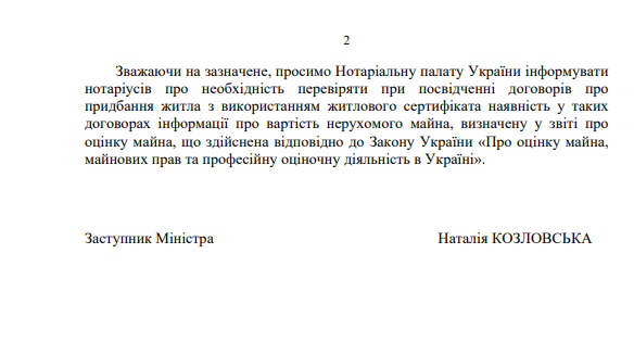 Так, при посвідченні договорів про придбання житла з використанням житлового сертифіката нотаріусам необхідно перевіряти наявність у таких договорах інформації про вартість нерухомого майна, визначену у звіті про оцінку майна, що здійснена відповідно до Закону України «Про оцінку майна, майнових прав та професійну оціночну діяльність в Україні». Зокрема про це поінформувало Мінінфраструктури у листі до НПУ.