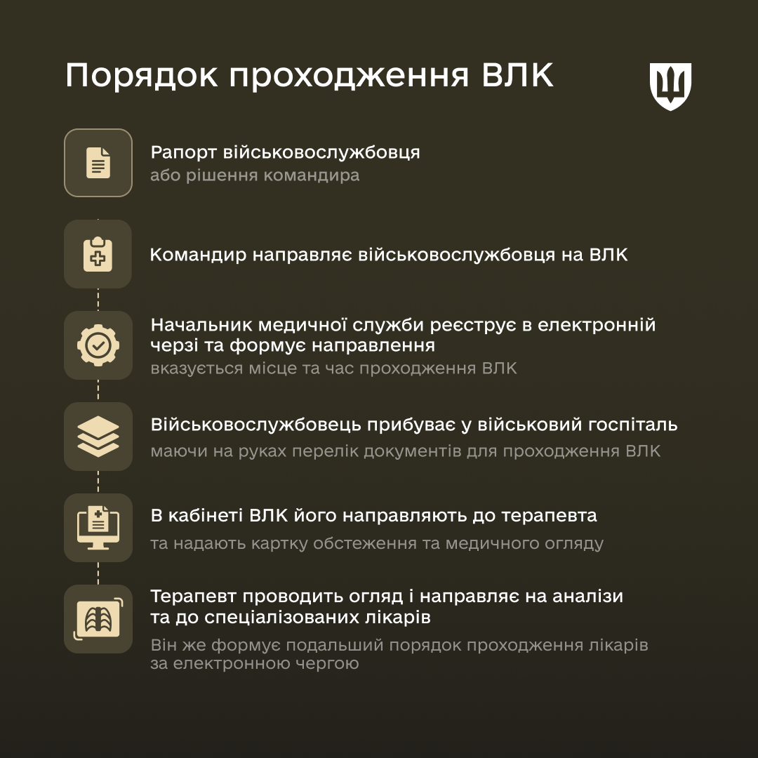 Для того, щоб потрапити на ВЛК, спершу військовослужбовцю потрібно подати рапорт своєму командиру. Командир також може самостійно ухвалити відповідне рішення і відправити військовослужбовця на ВЛК, повідомили у Міноборони.