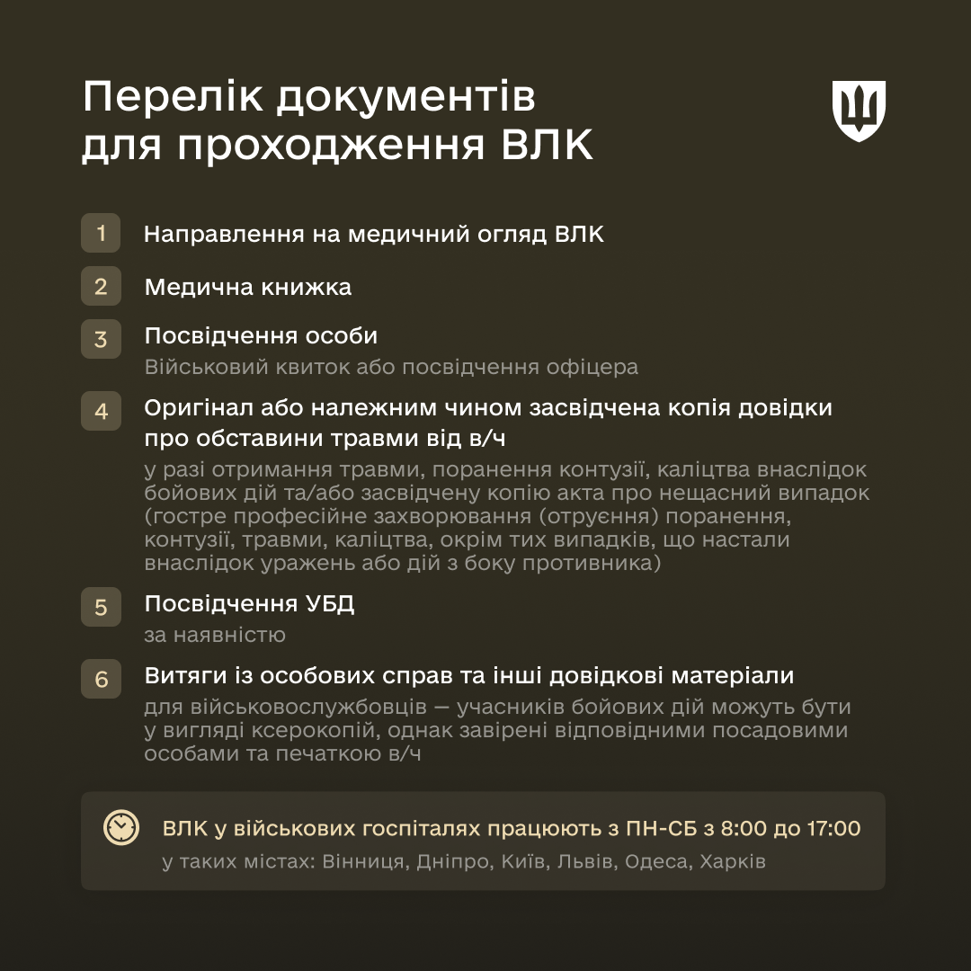 Пройти ВЛК в поліклініках військових госпіталів можна у Вінниці, Дніпрі, Києві, Львові, Одесі та Харкові. Працюють вони з понеділка по суботу з 8:00 до 17:00.