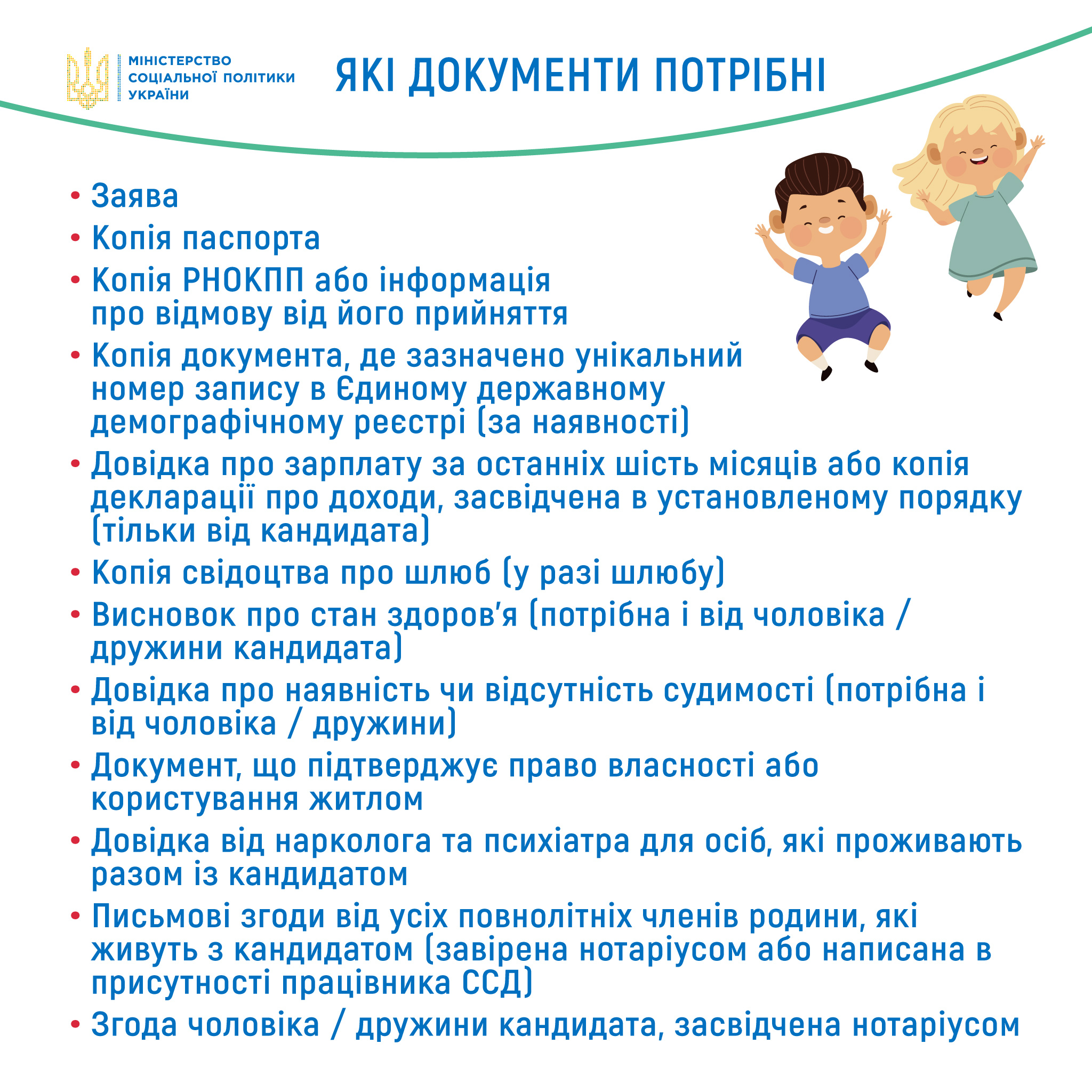 - письмову згоду всіх повнолітніх членів сім’ї, що проживають разом з майбутнім опікуном / піклувальником, засвідчену нотаріально або написану у присутності співробітника ССД, який приймає документи;