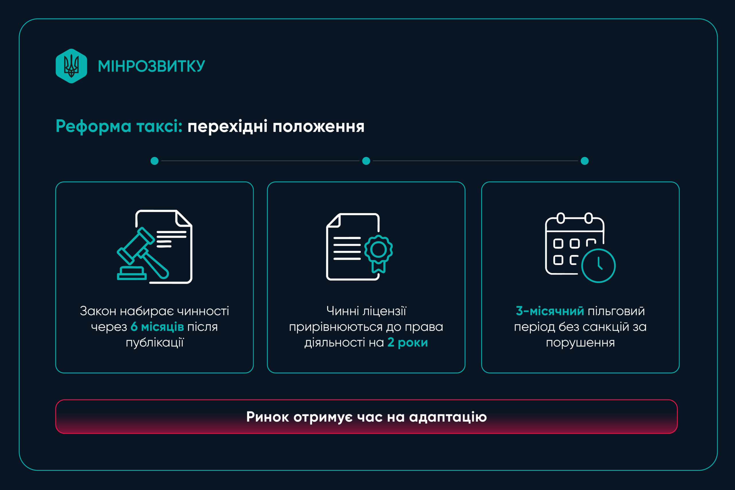 Міністерство розвитку громад та територій розробило концепцію реформи ринку таксі. Реформа передбачає легалізацію діяльності водіїв, цифровізацію доступу до ринку та впровадження європейських стандартів безпеки і відповідальності. Відповідний проєкт Закону «Про внесення змін до деяких законодавчих актів України щодо впорядкування перевезень пасажирів на таксі» покликаний вирішити системні проблеми галузі та вивести її з тіні.