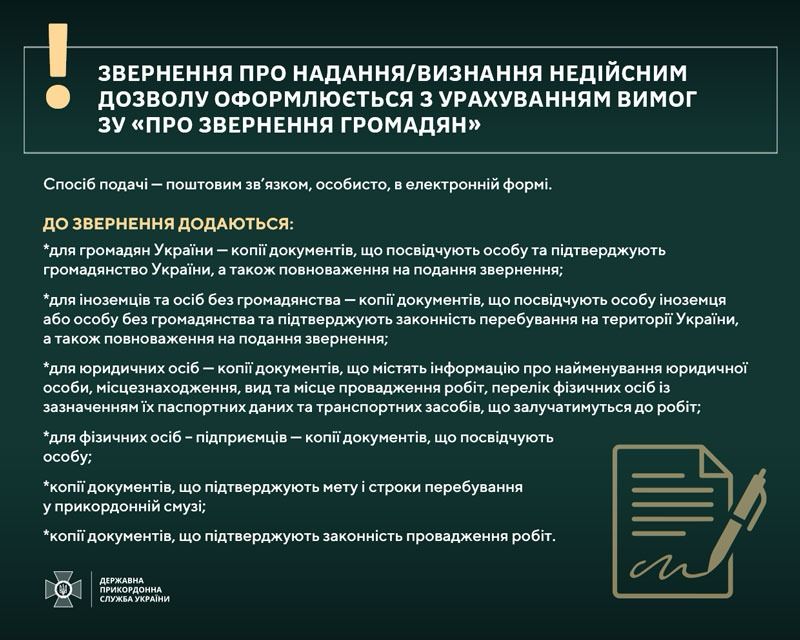 - Необхідність отримання дозволу від ДПСУ для в’їзду, перебування та виконання робіт у прикордонній смузі. Ця вимога стосується фізичних та юридичних осіб, а також вимагає звернення до органу Держприкордонслужби для отримання дозволу особам віком до 18 років від одного з батьків або законного представника.