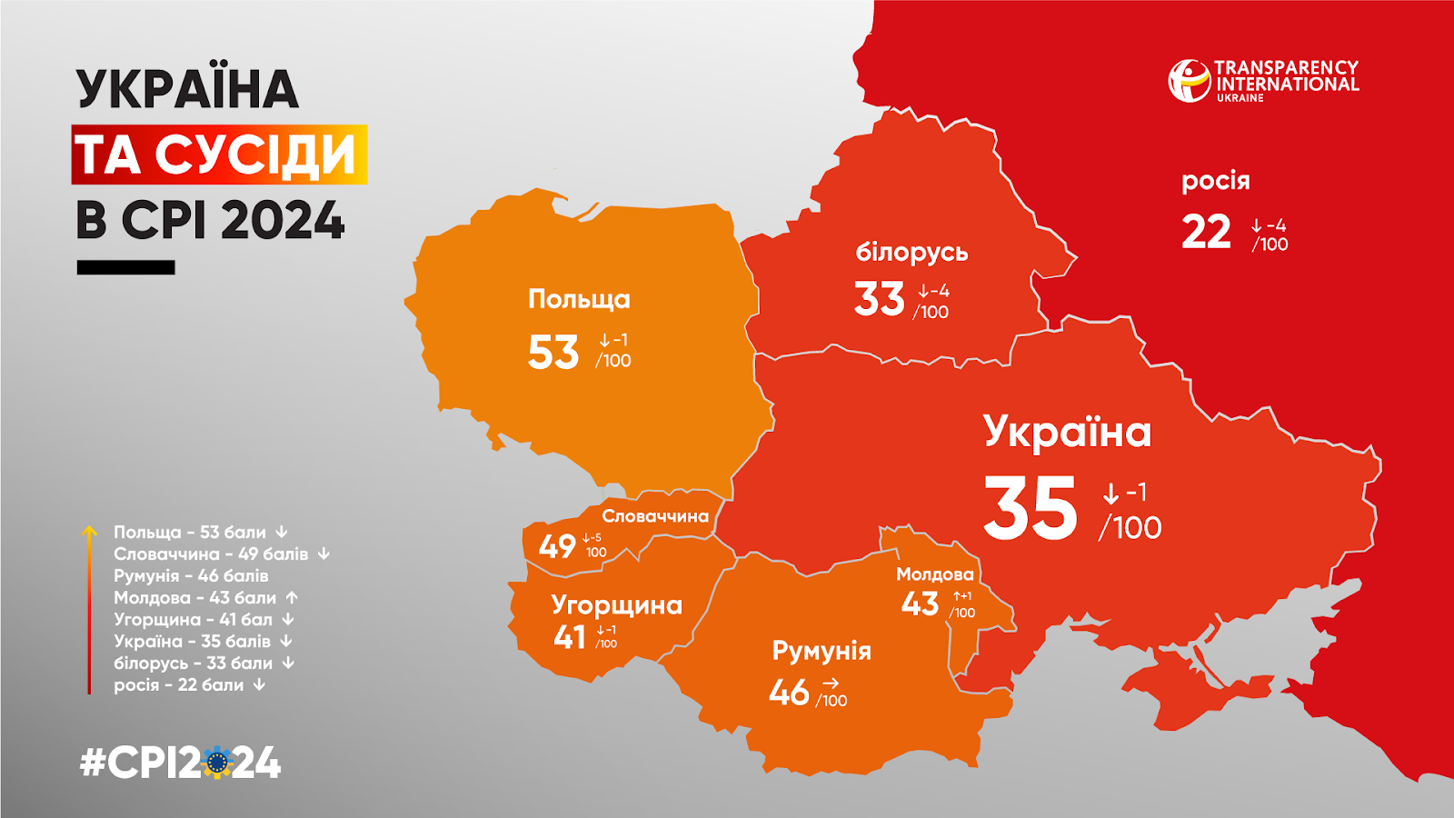 З-поміж сусідів Україна і надалі випереджає РФ — країна-терористка у 2024 році втратила аж 4 бали і з 22 балами посідає 154 позицію. І так само продовжує падіння РБ — північна сусідка торік теж втратила 4 бали, і тепер з 33 балами знаходиться на 114 сходинці.