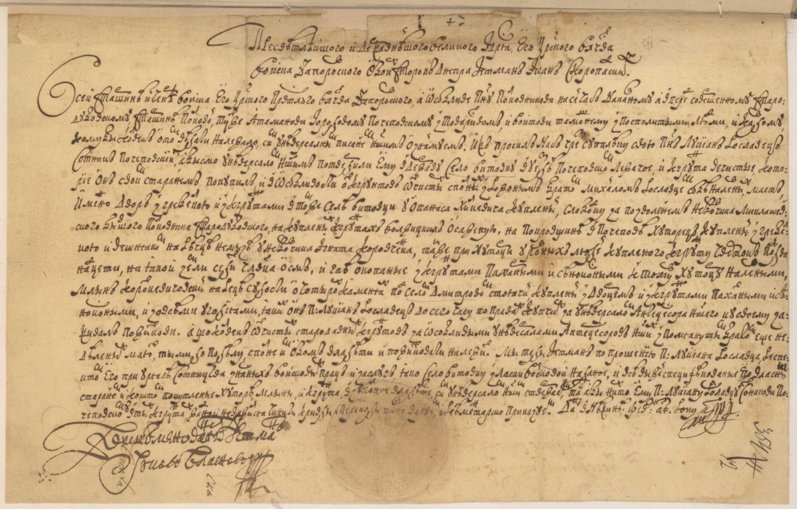 Універсал написаний староукраїнською мовою, засвідчений автографом гетьмана Лівобережної України Івана Скоропадського та скріплений рідкісним відбитком печатки