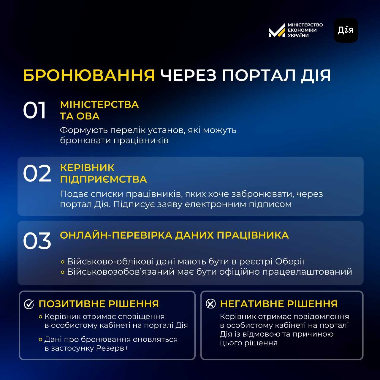 - В разі позитивного рішення система автоматично переводить військовозобов’язаного на спеціальний військовий облік на строк дії бронювання. З цього моменту він вважається заброньованим. Керівник підприємства чи уповноважена особа отримує сповіщення про це в особистому кабінеті на порталі Дія. Дані про бронювання працівника оновляться у застосунку Резерв+.