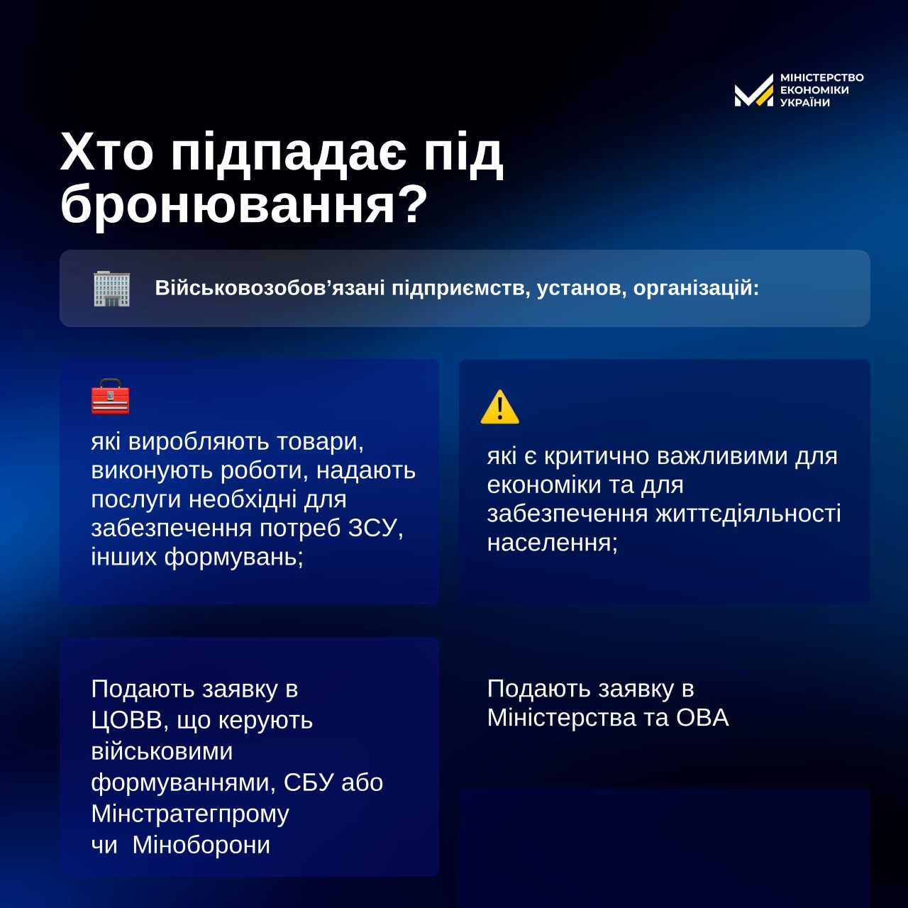 Підприємства, установи і організації, які здійснюють виробництво товарів, виконання робіт і надання послуг, необхідних для забезпечення потреб військових формувань (крім Збройних Сил), утворених відповідно до законів України, подають список до центральних органів виконавчої влади, що здійснюють керівництво такими військовими формуваннями, і до СБУ, в інтересах яких вони здійснюють виробництво товарів, виконують роботи, надають послуги, або до Мінстратегпрому, або Мінцифри (підприємства, які надають електронні комунікаційні послуги та/або послуги доступу до електронних комунікаційних мереж та їх інфраструктури).