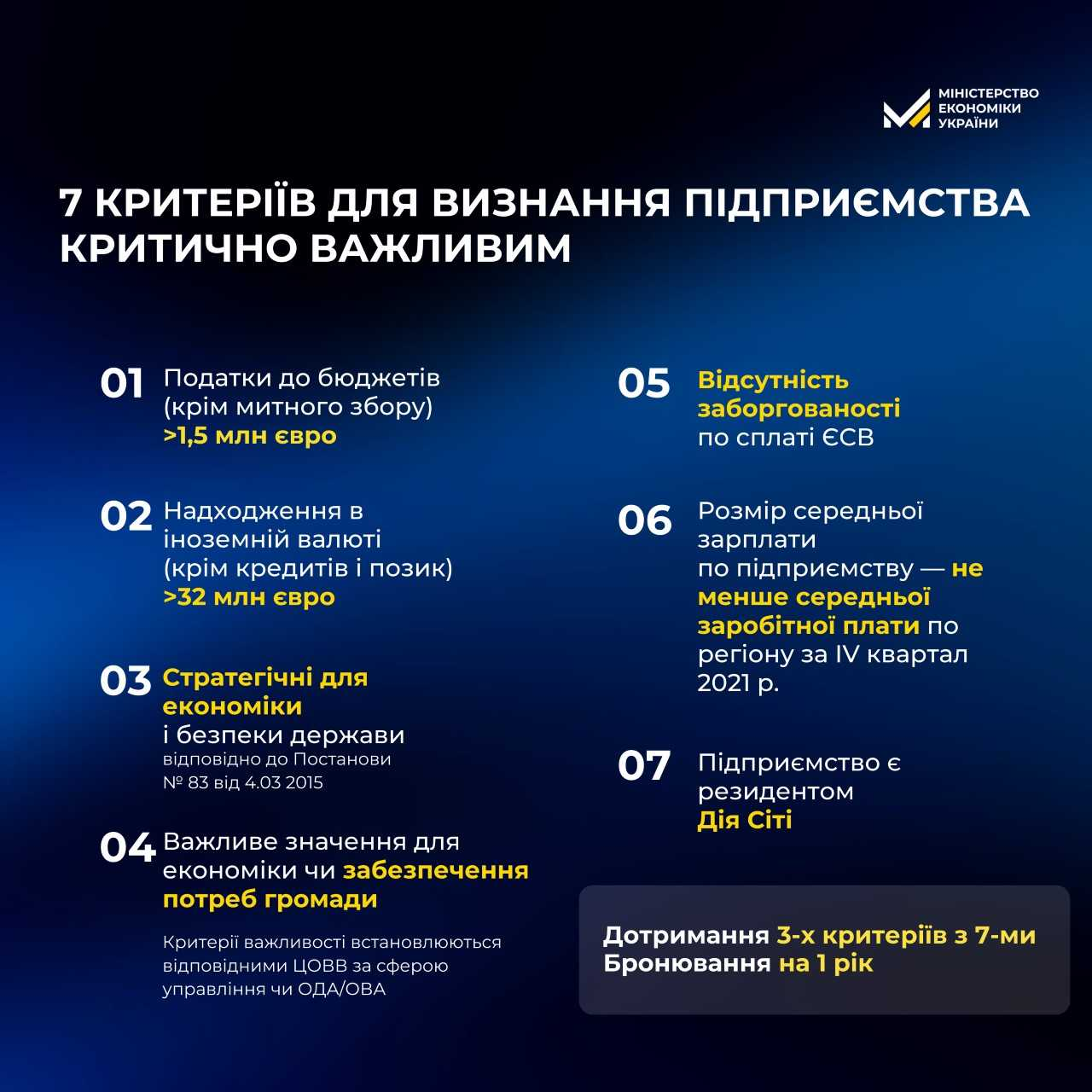 Працівники підприємств оборонно-промислового комплексу та енергетики зможуть бронювати до 100% працівників. Крім того, для критичних підприємств збільшили термін бронювання від 6 місяців до 12 місяців і дозволили бронювати військовозобов’язаних із дефіцитними військово-обліковими спеціальностями.