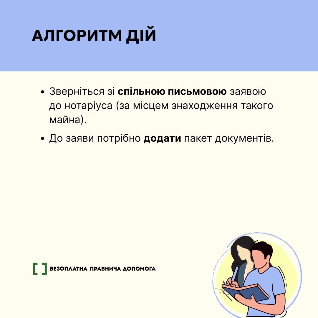 Зверніться зі спільною письмовою заявою до нотаріуса (за місцем знаходження такого майна). До заяви потрібно додати пакет документів.